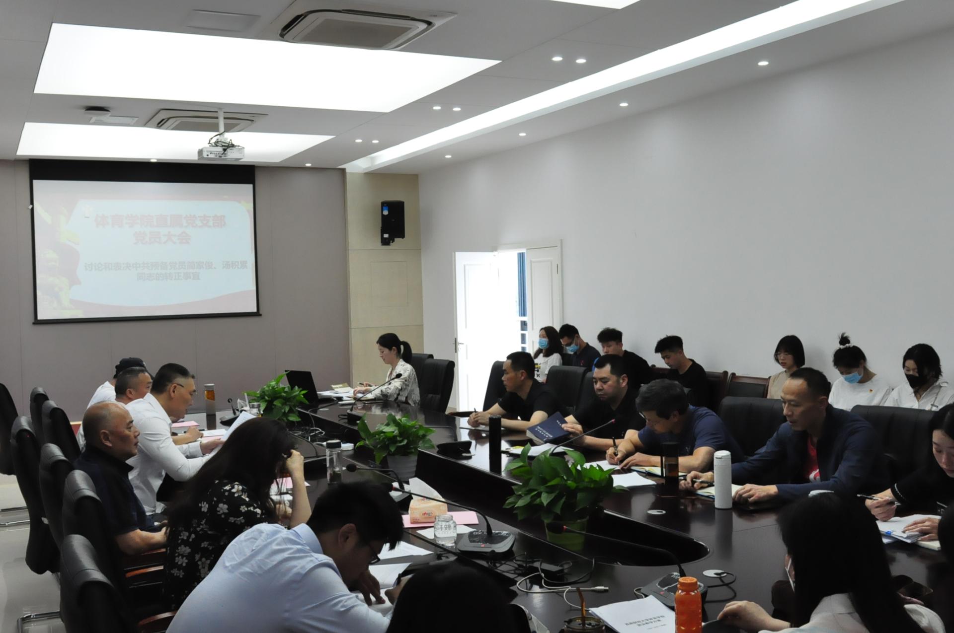 4月26日,乐鱼手机版app直属党支部在游泳池二楼会议室召开党员大会,讨论和表决中共预备党员简家俊、汤积累同志的转正事宜。支部全体师生党员参加,应到67人,实到49人。直属党支部书记杨远波主持会议。