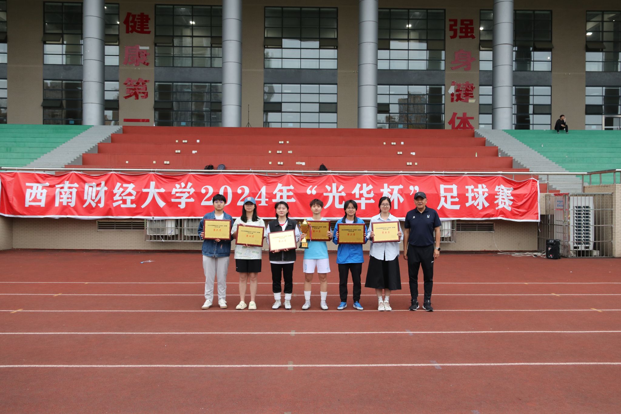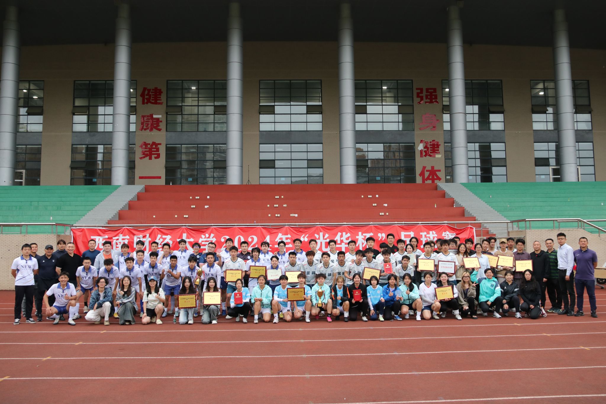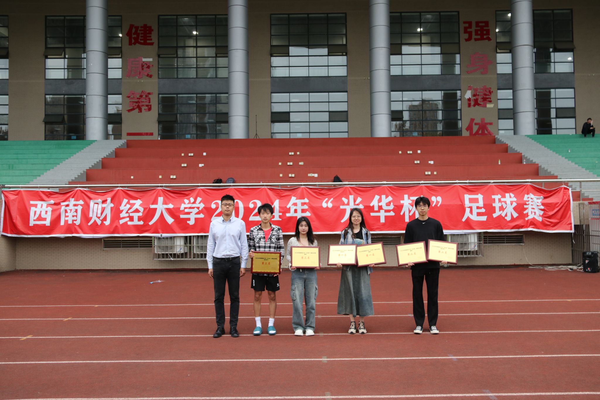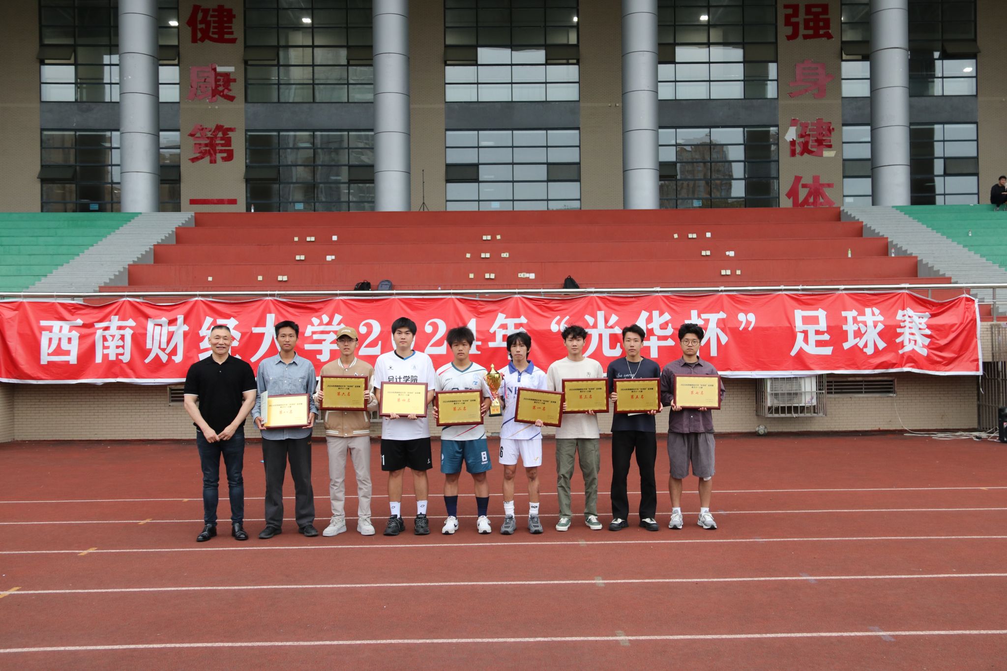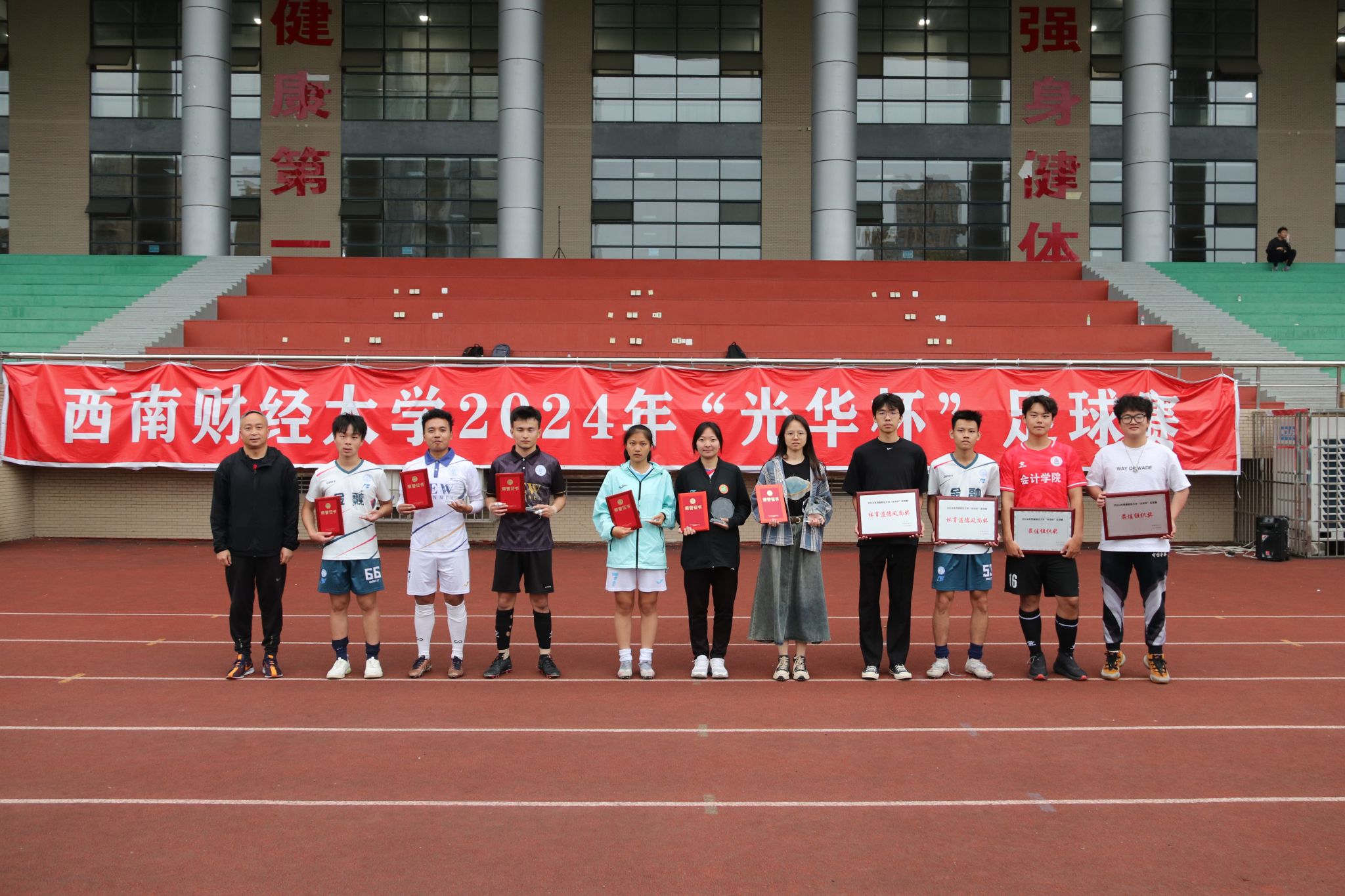 4月23日下午,“礼赞新时代·奋进新征程,迎百年校庆·铸西财辉煌”2024年西南财经大学“光华杯”足球比赛颁奖仪式在晨曦足球场举行。乐鱼手机版app院长杨远波,党委书记周正宏,副院长阴涛、陈丛刊,副书记李治为获奖学院以及个人颁发了荣誉证书及奖牌。