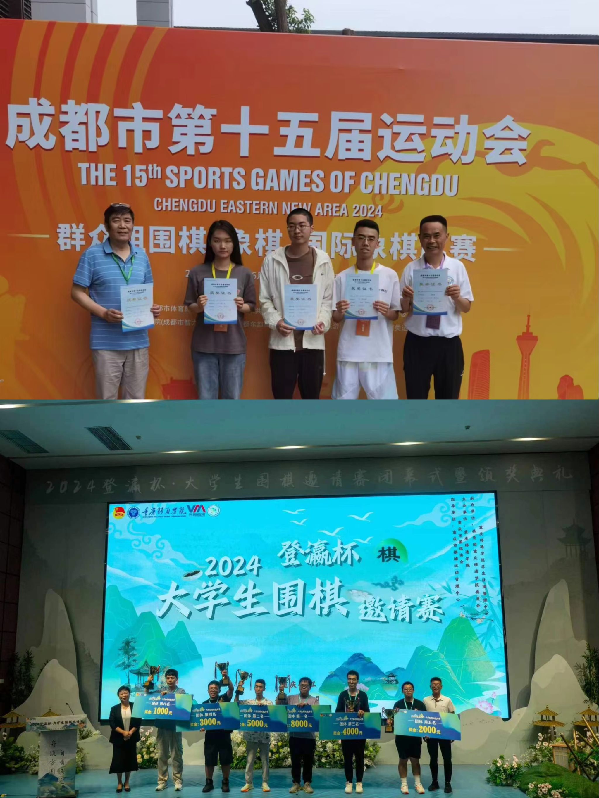 在成都市第十五届运动会群众组围棋比赛和在2024登瀛杯·大学生围棋邀请赛中,由王军和吴小丹老师带领,李锦澎、郭品瀚、曹子文、王冠桥、李赵晗同学组成的乐鱼(中国)围棋队分别取得了男子个人第八名、女子个人第八名、团体第五名和团体第二名,个人第七名的优秀成绩。