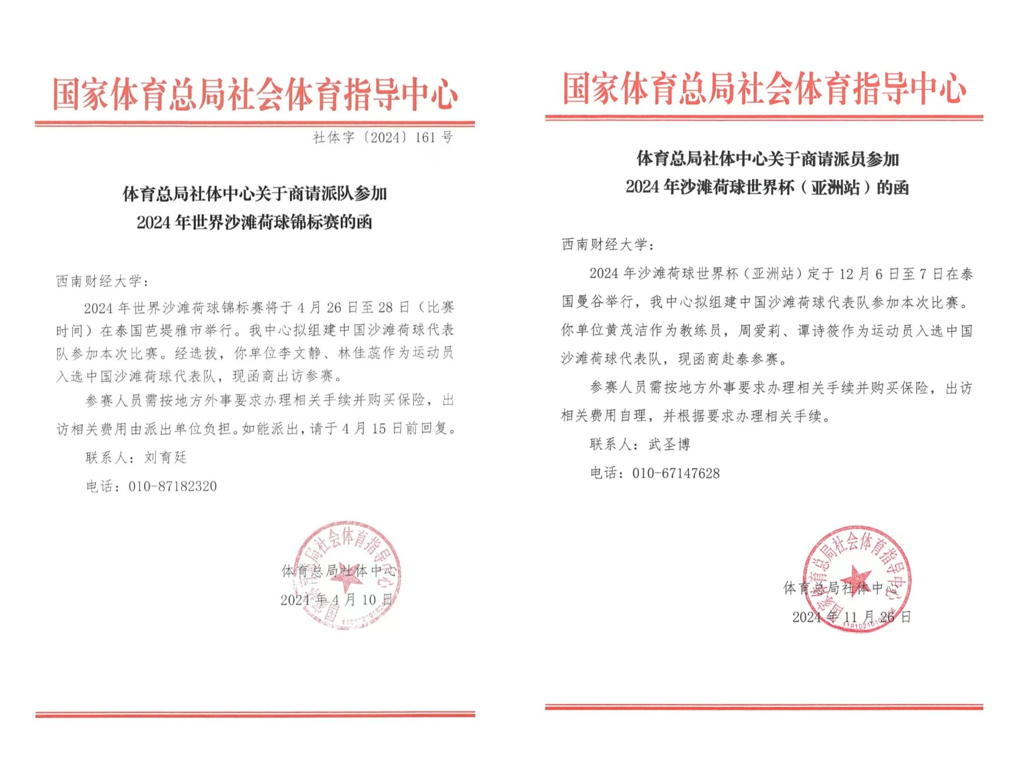 2024年12月6—7日,2024年沙滩荷球世界杯(亚洲站)在泰国曼谷举行。学校受体育总局社体中心商请,派出教师黄茂洁作为教练员,高水平女篮队员周爱莉、谭诗筱作为运动员随本次中国沙滩荷球国家队出国征战。整个赛事,中国沙滩荷球国家队经历6场对阵,取得3胜3负的战绩。在比赛中,队员们展现了顽强拼搏的精神和精湛的技术水平,尽管遇到了一些挑战,但队员们始终团结一致,发挥出色,最终取得了第五名的好成绩。