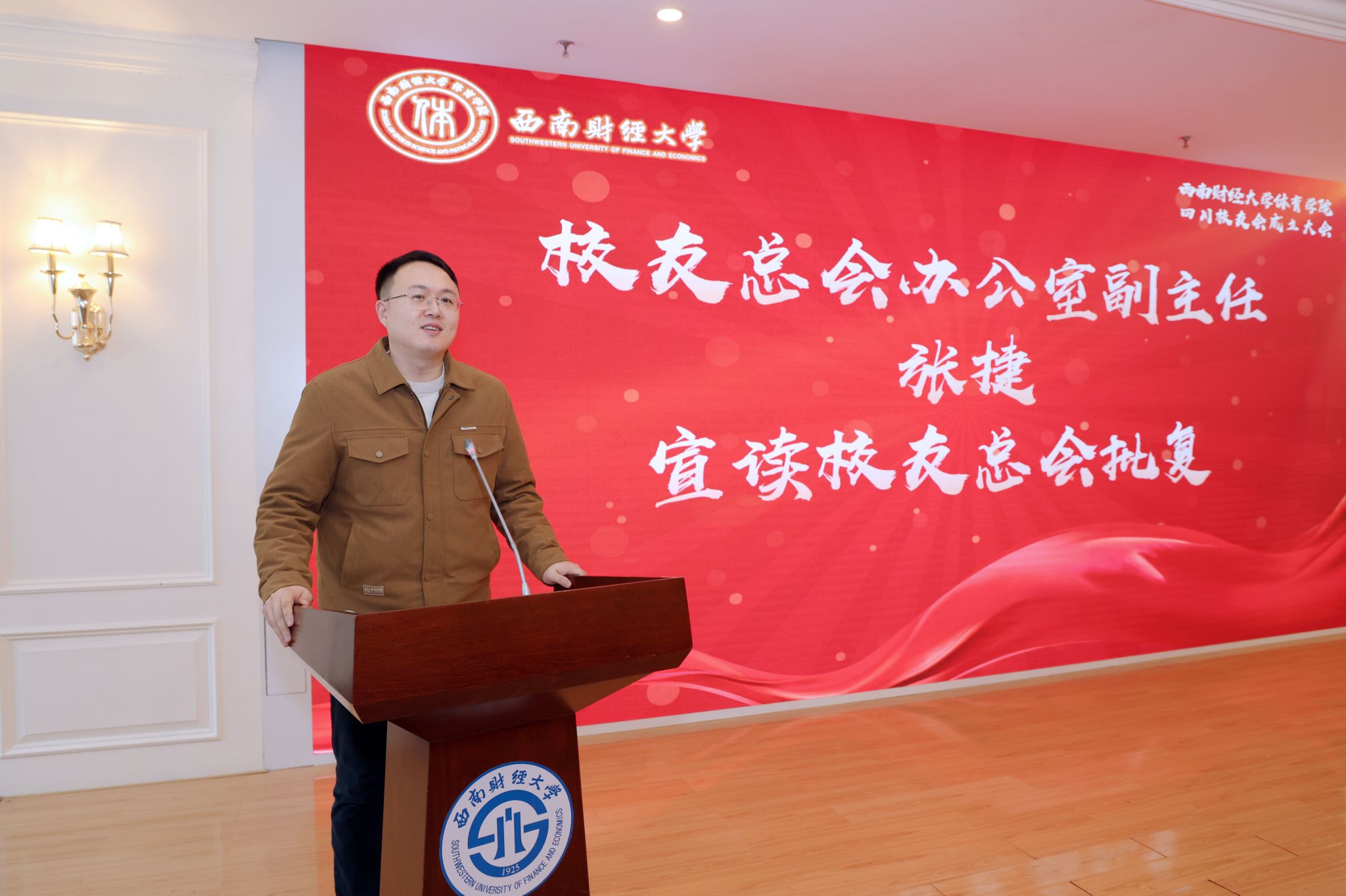 张捷宣读学校校友总会批复,为乐鱼手机版app四川校友会授牌,向乐鱼手机版app四川校友会的成立致以热烈祝贺。