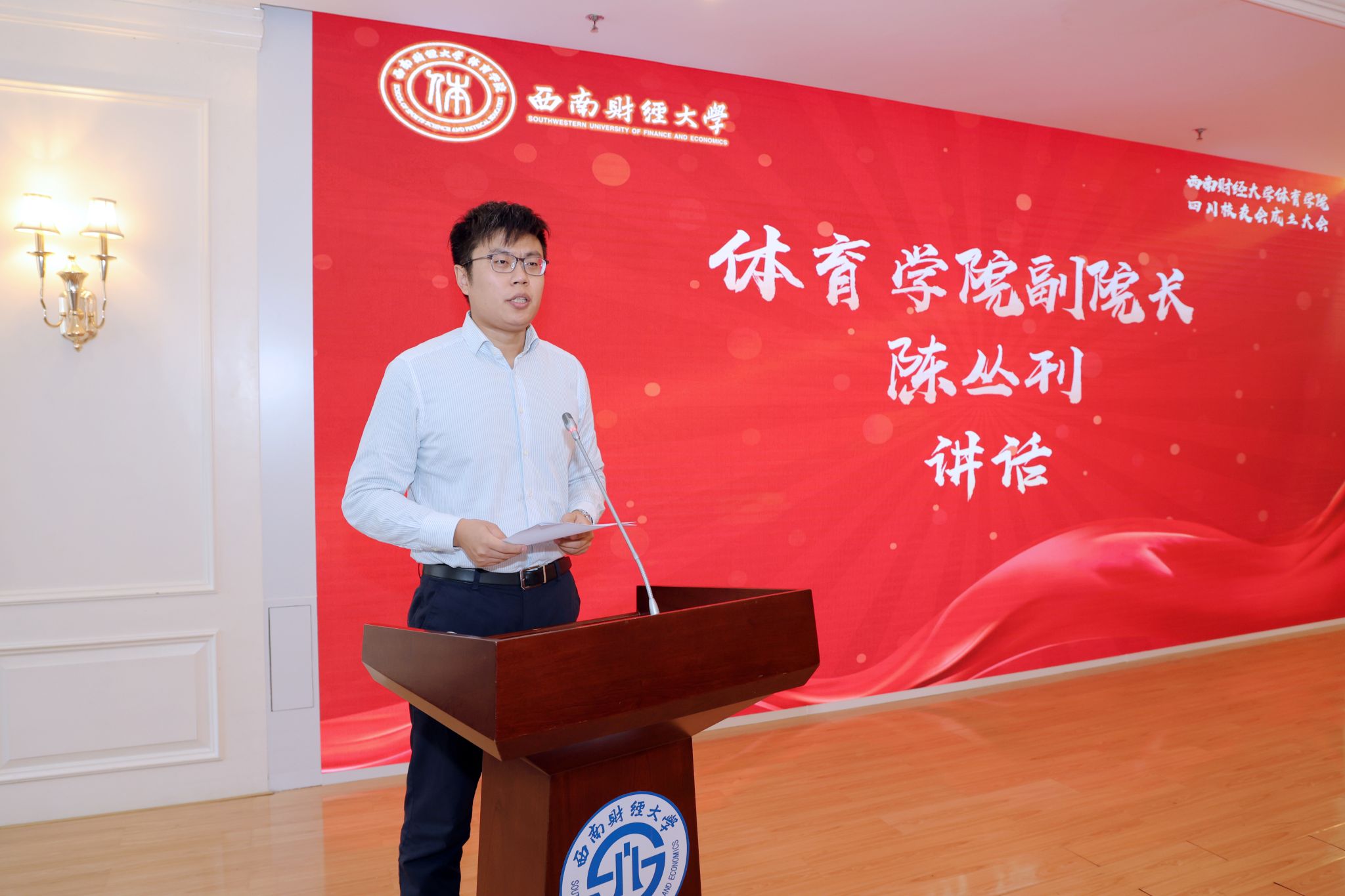 学院主持工作的副院长陈丛刊,代表学院向新成立的乐鱼手机版app四川校友会表示衷心祝贺,向与会校友表示热烈欢迎。他深情回顾了学科发展历程,详细阐述了学院自成立至今的建设情况和未来发展愿景,以及学院四川校友会成立的重要意义。他强调,学院取得的成绩离不开全体师生员工的努力奋斗,更离不开广大校友的大力支持。校友是学校最宝贵的财富,与母校是荣辱与共的命运共同体,学院要着力构建校友与母校沟通联络的桥梁,搭建信息交流、资源共享的平台,与广大校友一道共叙母校深情、共谋学院发展,为加快建设教育强国贡献西财体育力量。