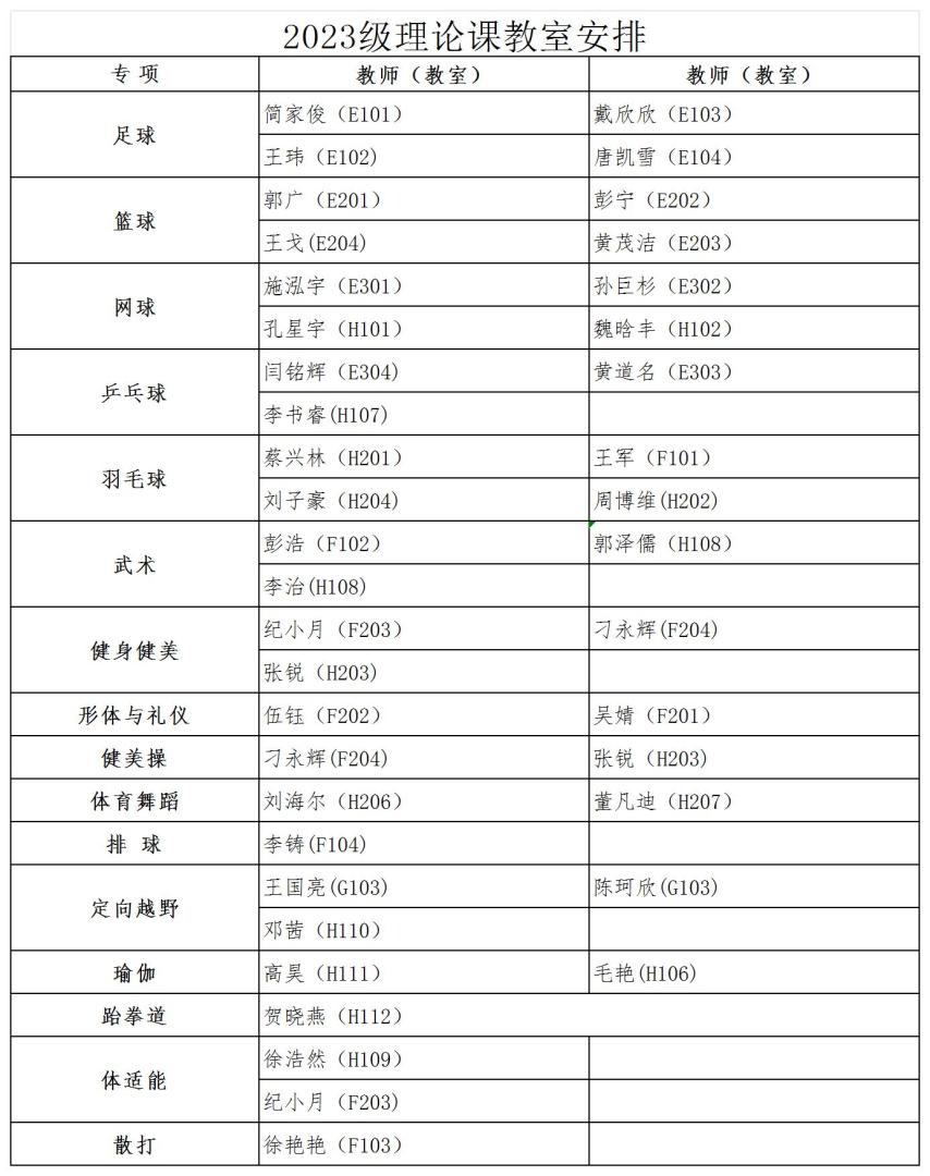经教务处同意,本学期2023级本科生第3周体育课为乐鱼(中国)理论课,10月7日起恢复户外教学。根据教室资源状况,现将理论课具体安排通知如下: