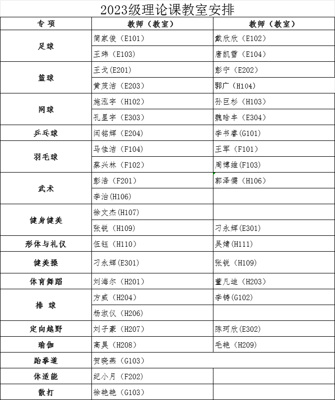 经教务处同意,本学期2023级本科生第1周体育课为乐鱼(中国)理论课,9月14日起恢复户外教学。根据教室资源状况,现将理论课具体安排通知如下: