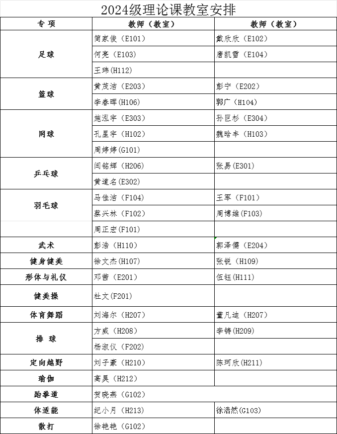 经教务处同意,本学期2024级本科生第3周体育课为乐鱼(中国)理论课,9月29日起恢复户外教学。根据教室资源状况,现将理论课具体安排通知如下: