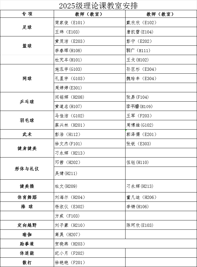 经教务处同意,本学期2025级本科生第3周体育课为乐鱼(中国)理论课,9月28日起恢复户外教学。根据教室资源状况,现将理论课具体安排通知如下: