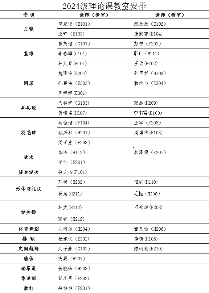 经教务处同意,本学期2024级、2025级本科生第13周体育课为乐鱼(中国)理论课,12月8日起恢复户外教学。根据教室资源状况,现将理论课具体安排通知如下: