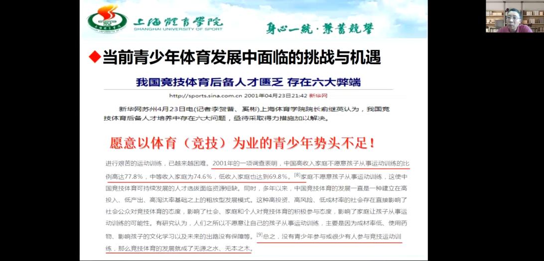 2021年5月12日下午15:30,上海乐鱼手机版app副校长、博士生导师唐炎教授通过线上方式,举办了题为《体教融合背景下我国青少年体育发展的思考》的光华讲坛。在外地出差培训学习的乐鱼手机版app院长杨远波教授在线主持了讲座,乐鱼手机版app研究生及部分教师参加了此次讲座。