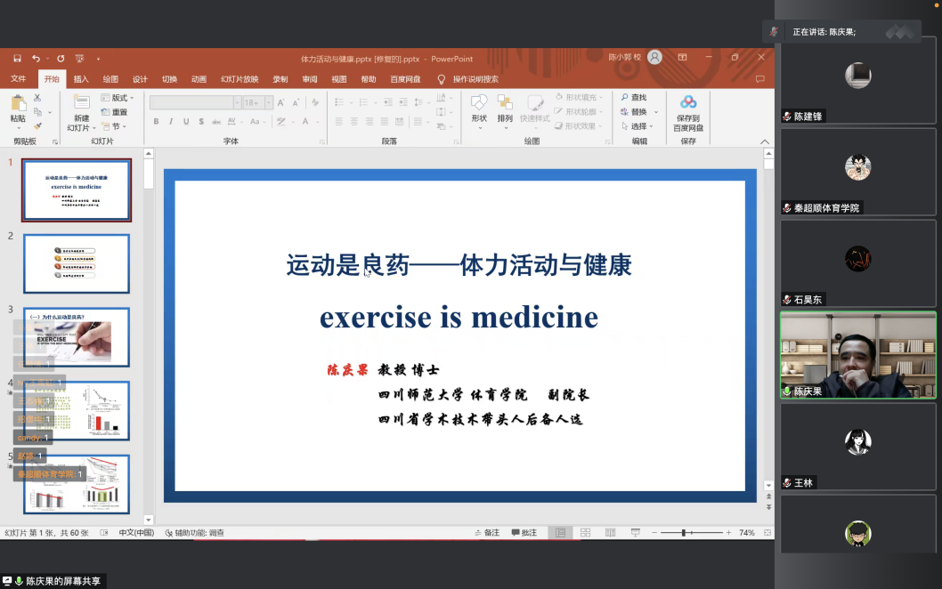 2022年11月10日,四川师范大学乐鱼手机版app副院长陈庆果教授在线上举办了题为《再谈运动与健康:运动是良医》的光华讲坛,乐鱼手机版app副院长陈丛刊主持本次讲座,乐鱼手机版app研究生、部分教师以及校内外师生等共计60余人参加了此次讲座。